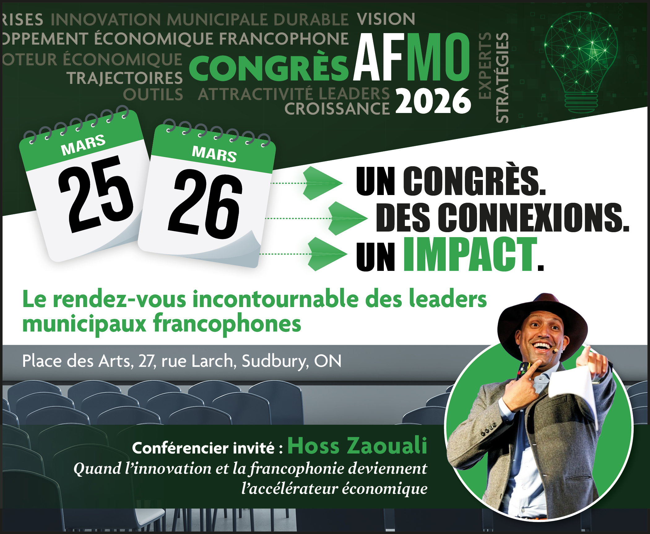 Bonjour à vous, chères municipalités de l’Ontario, Nous avons le plaisir de vous inviter à participer au Congrès annuel de l’Association francophone des municipalités de l’Ontario (AFMO), qui se tiendra les 25 et 26 mars 2026 à Sudbury.